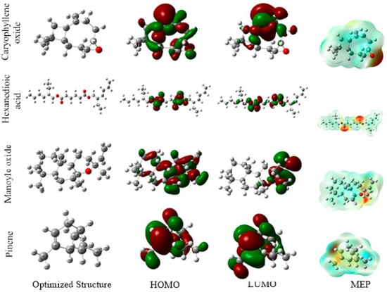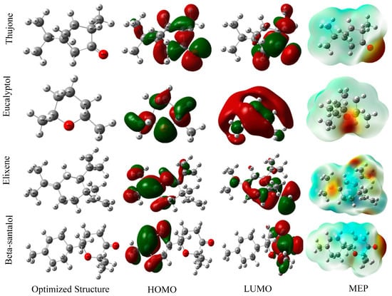 Investigating the connection between an inhibitor’s structure and its electrical and corrosion properties is achievable theoretically (Table 4). Moreover, Figure 5 and Figure 6 display the electron density and electrostatic charge of electrons (ESPMs) distribution between the elements of the HOMO and LUMO atomic orbits. This finding indicates that the examined EOs’ electron molecules share a common metal-d route because the majority of their reaction space is dispersed correctly, as seen by the HOMO and LUMO orbitals. Also, according to the ESPMM classification, oxygen atoms determine the overall density of red pigments in molecular electrostatic potential (MEP) analysis. This can lead to adsorption effects on mild steel []. For Artemisia herba-alba EOs, the responsible compounds send electrons to the mild steel surface because of the higher value of EHOMO as compared to other molecules. In addition, beta-santalole has the smallest energy gap, which can explain the anti-corrosion properties of beta-santol more than those of thujone and eucalyptol molecules []. For Juniperus phoenicea EOs, the pinene component shares electrons with the d-vacant orbital of iron more than other molecules []. In addition, caryophyllene oxide has a small energy gapthat reflects its reactivity compared to other products []. According to Lukovist’s study []., enhancing the metal’s ability to donate electrons can slow the corrosion process because all investigated molecules have a ∆N value of <3.6 []. When it comes to the value of the dipole moment, some authors claim that corrosion prevention rises with effectiveness, while others claim that it is inconsistent and therefore useless. Our measurements are able to evaluate the effectiveness of various molecules in the studied EOs [].