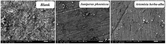 As a result of the attack of the aggressive solution (1 M HCl alone) in the absence of inhibitors, the mild steel surface was highly damaged and heavily corroded, due to the rapid rate of iron dissolving in a corrosive environment. However, after adding 1 g/L of Juniperus phoenicea and Artemisia herba-alba to the acidic solution, the surface became more uniform and smoother []. Compared to the blank, the surface of the material treated with inhibitors was protected. These results confirm the ability of the two studied EOs to prevent surface corrosion of mild steel in 1 M HCl solution by creating a layer of surface coating that grants protection against corrosion.