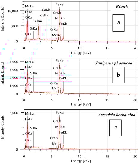 On the other hand, EDX was used to determine the initial composition of mild steel samples before and after the addition of the examined inhibitors. The increase in carbon atom percentages in EOs is visible in the EDX spectra. When the Juniperus phoenicea inhibitor is present, the amount of carbon atoms increases, which can be explained by the components of the investigated EOs adhering to the surface and forming a protective layer []. Moreover, the iron peak was visible using both EOs; this is probably owing to the presence of a conservative layer, which can only stiffen the material’s surface.