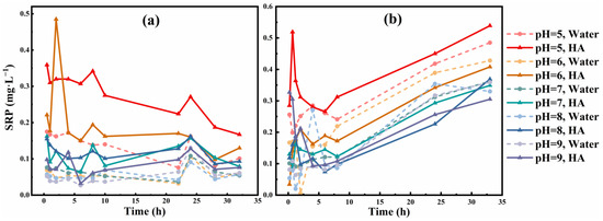 SRP release concentration of phosphate ore (a) S1 and (b) S2 at 2 mg·L−1 of HA concentration at five pH levels. Water and HA represent pure water and HA solution, respectively.
