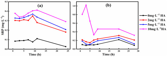 SRP release concentration of phosphate ore (a) S1 and (b) S2 at different HA concentrations at pH 6.