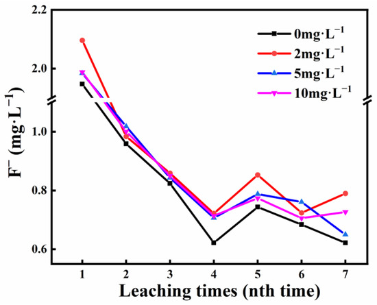 The net release of fluoride ions after each leaching for 2 h is shown in Figure 3. From the first leaching to the third leaching, the amount of F− released gradually decreased. After the third leaching, the release of F− showed a steady fluctuation trend, and the concentration was about 0.6~0.8 mg·L−1. The release of fluoride ions from phosphate ore S1 also effectively increased in the presence of HA (Figure 3). The results lead us to pay more attention to water safety. As for the difference in the regularity of F− and SRP release at different HA concentrations, it is possible that the low solid-to-liquid ratio (1:2) and the different experimental conditions (constant temperature shaking) affected the function of HA on the dispersion of phosphate ore.