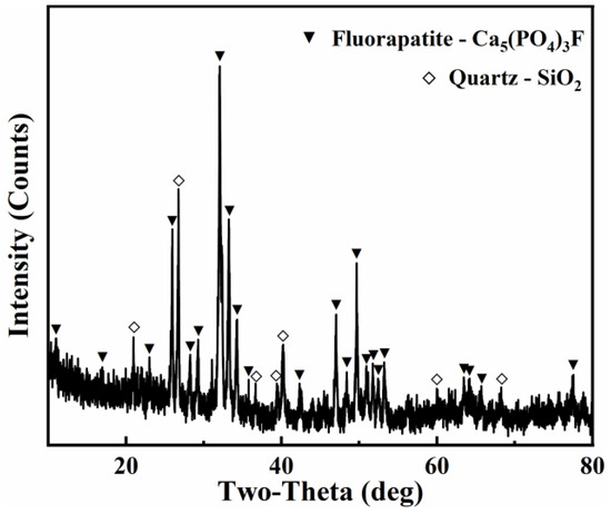 We used phosphate ore S1 to explore the mechanism. The results of XRF indicated that the phosphate ore mainly contained CaO (45.875%), P2O5 (29.954%), SiO2 (15.910%), F (1.936%), and a small amount of oxide (Table S1). The X-ray diffraction patterns of phosphate ore demonstrated that the major mineral phases include fluorapatite (Ca5(PO4)3F) and quartz (SiO2) (Figure 4). The main peaks of fluorapatite were at 2θ = 26.6°, 28.5°, 32.9°, 34.6°, and 36.8°, while the main peaks of quartz were at 2θ = 20.9°, 26.6°, 50.4°, and 62.4°. This result is consistent with the major component of the XRF. The surface morphology of the phosphate ore is shown in Figure 5 and is described below.