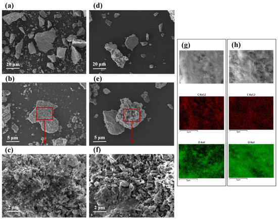 Representative SEM images of (a–c) raw phosphorous ore and (d–f) phosphorous ore after reacting with 10 mg·L−1 HA; element mapping of (g) raw phosphorous ore and (h) phosphorous ore after reacting with 10 mg·L−1 HA.