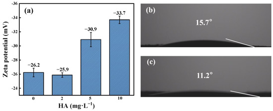 (a) The zeta potential on the phosphate ore S1 surface at different HA concentrations at pH 6; contact angles of (b) raw phosphate ore and (c) phosphate ore after reacting with 10 mg·L−1 HA at pH 6.
