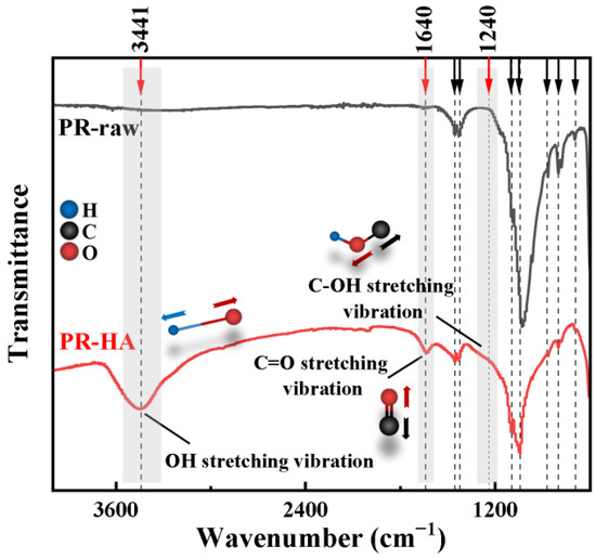 Fourier-transform infrared spectra for phosphate ore samples at pH 6. PR-raw represents the primary phosphate ore, and PR-HA represents the phosphate ore after reacting with 10 mg·L−1 HA.