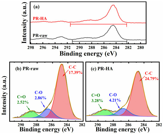 The XPS spectra of C 1s. The survey and high-resolution scans of XPS spectra of phosphate ore before and after reacting with HA. (a) Total survey scans of C 1s; (b) C 1s peaks of phosphate ore; (c) C 1s peaks of phosphate-ore–HA. PR-raw represents the raw phosphate ore, and PR-HA represents the phosphate ore after reacting with HA.