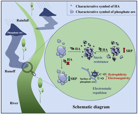 Here, the possible underlying mechanism of phosphate ore SRP release by HA is briefly explained (Figure 9). As the phosphate ore enters the liquid phase containing HA, the HA layer surrounds the phosphate ore surface, changing its surface charge and the abundance of the hydrophilic functional groups. On the one hand, the suspension stability is enhanced by steric resistance and electrostatic repulsion, and the aggregation and deposition of phosphate ore are inhibited. On the other hand, the enhanced surface hydrophilicity breaks down the aggregation structure with small forces, increases their contact area with the liquid phase, and the hydrophilic functional groups originally wrapped in the bundle interact with water molecules, which increases the contact area with the liquid phase, and the hydrophilic functional groups originally wrapped in the bundle interact with water molecules.