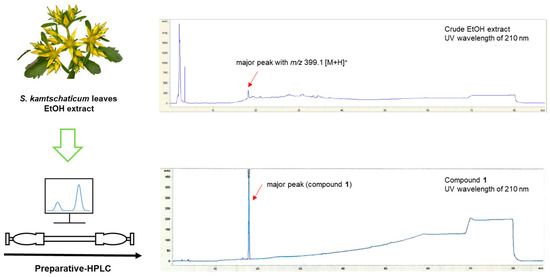 Separation of compound 1 from S. kamtschaticum leaves and HPLC–UV chromatograms of crude EtOH extract and compound 1.