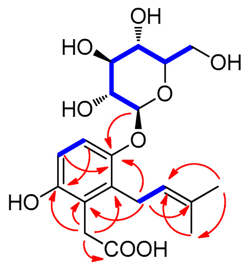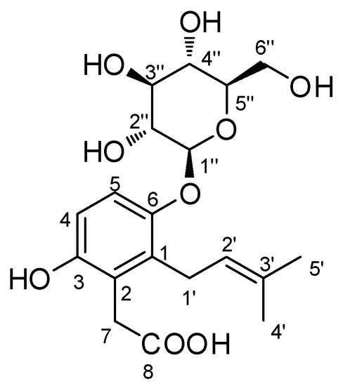 The COSY spectrum (Figure S6) analysis revealed a correlation between the methylene protons (H-1′) and the olefinic proton (H-2′). Further analysis of the HMBC experiment (Figure S8) demonstrated correlations between H-4′/C-5′, H-4′/C-3′, H-4′/C-2′, H-5′/C-4′, H-5′/C-3′, and H-5′/C-2′. These correlations confirmed the presence of the prenyl residue (Figure 3). It was determined that the prenyl unit was attached to C-1 by the interpretation of the HMBC correlations between H-1′/C-1 (δC 127.7), H-1′/C-2 (δC 129.0), and H-1′/C-6 (δC 160.9). The observation for HMBC correlation between an anomeric proton (H-1”) at δH 4.93 and C-6 (δC 160.9) confirmed that the glucose sugar unit was linked to C-6 (Figure 3). In addition, the COSY spectrum indicated the key correlation between H-4 (δH 6.83) and H-5 (δH 7.00) in the aromatic ring, and the HMBC spectrum of 1 also included the correlations for H-4/C-2 (δC 129.0), H-4/C-6 (δC 160.9), H-5/C-1 (δC 127.7), and H-5/C-3 (δC 149.2). Finally, the remaining methylene proton at δH 3.65 (2H, s) displayed HMBC correlations with carbons C-1 (δC 127.7), C-2 (δC 129.0), C-3 (δC 149.2), and C-8 (δC 180.4), indicating that the acetic acid moiety was positioned to the C-2 position (Figure 3). These results helped us elucidate the gross structure of compound 1, as depicted in Figure 2.