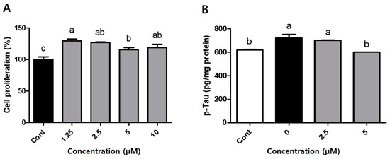 Alzheimer’s disease (AD) is the primary cause of dementia, accounting for approximately 50–60% of all cases of dementia. Over the next century, the burden of AD will continue to increase, both in terms of disability and healthcare costs, with the growing number of patients predicted to reach 81 million by 2040 [1]. Intensive research on the pathogenic mechanisms of AD has shed light on the complex interaction of amyloid β aggregation and deposition, hyperphosphorylation of tau and tangle formation, neurovascular dysfunction, inflammation, mitochondrial dysfunction, cell-cycle abnormalities, and cell death induced by oxidative stress [2]. Of these pathogenic mechanisms, hyperphosphorylation of tau has been studied for its contributing role to the neuronal death underlying dementia. Tau is a protein primarily found in axons that plays a crucial role in promoting microtubule stabilization and assembly. Hyperphosphorylation of tau begins intracellularly and induces a sequence of pathogenic events in AD, namely, the disassembly of microtubules associated with neuronal dysfunction. Hyperphosphorylated tau forms insoluble fibrils, termed neurofibrillary tangles [3]. Recent studies have demonstrated that preventing or reducing tau accumulation leads to improvements in cognitive and motor dysfunction in various animal models of AD [4]. However, currently available drugs only relieve symptoms temporarily, without providing a cure. Thus, the identification of natural bioactive products that can help prevent AD is an attractive area of study. Tau has emerged as a promising therapeutic target in the development of bioactive compounds for AD prevention.