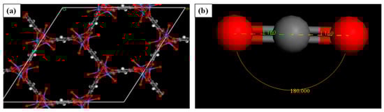 This study used the Material Studio tools license from Biovia Dassault Systemes with a sorption module to perform the adsorption of CO2 in CPO-27. The structure of M-CPO-27 (M = Mg, Co, Zn, and Mg) was obtained from the Cambridge Structural Database (CSD). The impurities in the structures were cleaned in order to obtain the hexagonal structure of the R3 space group [30]. CO2 is drawn to be set as the adsorbate for CPO-27 with an angle of 180° and a C=O double bond length of 1.16 Å. Figure 1a,b show the structure of Ni-CPO-27 and CO2, respectively, before performing adsorption analysis. In the CPO-27 structure, simulation boxes were constructed with periodic boundary conditions in order to obtain an optimum adsorption system [31].