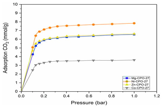 Adsorption isotherm of CO2 in M-CPO-27 (M = Mg, Ni, Co, and Zn).