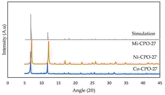XRD patterns prepared for M-CPO-27 (M = Co and Ni) from the solvothermal method are shown in Figure 3 for experimental and simulation results, and the same trends were achieved by Mg-CPO-27 and Zn-CPO-27. The main peak is identified and compared with the theoretical pattern from a previous study [47]. As displayed, there are fewer peaks showing broadening found in the XRD pattern, which explains the presence of the crystalline nature in CPO-27 [35]. In the simulation study, we can perceive that the structure has less crystallinity compared with the experimental results as the intensity (second peak onwards) is lower. A further improvement in structure optimization should be performed to achieve a high-crystal structure. High-quality crystals could not be achieved easily based on single-crystal X-ray methods, but this PXRD pattern helps us to estimate unit cell parameters based on the trigonal spatial group (R-3) corresponding to CPO-27 materials [34,48,49]. The agreement between the experiment and other literature data was quite good and proves CPO-27 materials have been achieved.