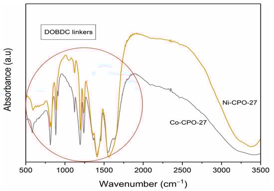 Similar to powder X-ray Diffraction (XRD), the IR spectroscopy region of the organic ligand in CPO-27 is between 650 and 1800 cm−1, which was commonly taken as fingerprints for this material. XRD is sensitive to the crystal structure of the material, while that region in spectroscopy is more sensitive to the conformational or local environment of organic molecules (short-range information) [34]. Figure 4 shows the FTIR spectra for the CPO-27 group, and similarities between the IR region and the experimental result can confirm (dobdc = 2,5-dioxido-1,4-benzenedicarboxylate) that the organic ligand is present, as strongly indicated by M-based CPO-27 groups.