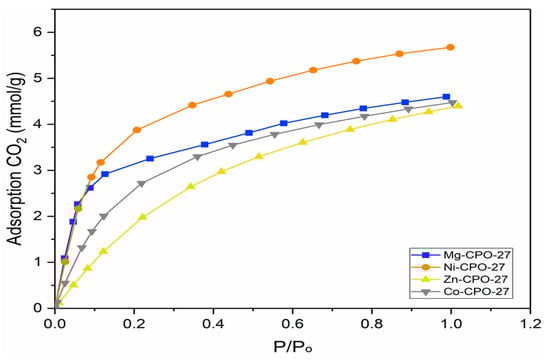 It is important to validate the computational method using the experimental approach as the structure in the simulation was assumed in bulk and pure conditions without any defects [36,51]. Meanwhile, in real conditions, it is very difficult to synthesize defect-free crystals [36]. Therefore, an experimental study is needed to validate the simulation method. Figure 5 shows the low pressure of CO2 adsorption isotherms collected for M-CPO-27 (M = Co, Mg, Ni, and Zn) using the solvothermal method at 298 K.