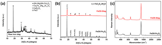 XRD patterns of (a) converter slag and (b) extracted FeOX-Fe2O3 and FeOX-Slag and (c) Raman spectra of FeOX-Fe2O3 and FeOX-Slag.