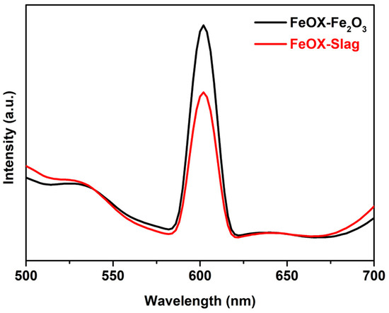 PL measurements were utilized to evaluate the impact of the preparation of iron oxalate using converter slag (FeOX-Slag) that contains some other impurities such as Mg and Mn on the separation and transfer of electrons and holes during light irradiation. As shown in Figure 6, the emission spectra of both FeOX-Slag and FeOX-Fe2O3 samples are in the 500–700 nm region. Generally, a low PL intensity is indicative of a low rate of electron–hole pair recombinations. The distinct formulation of the FeOX-Slag, comprising additional impurities like Mg and Mn, resulted in enhanced charge carrier separation, as shown by the reduced PL emission intensity of FeOX-Slag in comparison to FeOX-Fe2O3 at a wavelength of 600 nm under a 350 nm excitation. Based on the photoluminescence (PL) results, the electronic characteristics, encompassing charge separation and electron transport, exhibited enhancement due to the formation of Ets through the incorporation of impurities like Mg and Mn within the FeOX-Slag sample matrix.