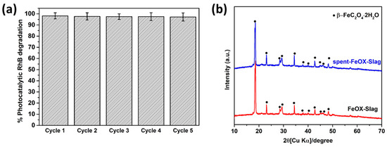 The practical application of catalysts heavily relies on their stability and reusability [35]. The product’s recyclable nature was evaluated throughout five cycles of FeOX-Slag for RhB degradation. The results depicted in Figure 8a indicate that FeOX-Slag exhibits high stability and recyclability in the context of RhB decomposition under light exposure. Specifically, the photocatalytic breakdown of RhB over FeOX-Slag remained consistent across five cycles, resulting in an impressive elimination rate exceeding 97% within a 90-min timeframe. XRD was used to evaluate the stability of FeOX-Slag following the first cycle of photocatalytic elimination of RhB to that of fresh slag. It can be seen in Figure 8b that the RhB deterioration did not affect the FeOX-Slag phase structures, as shown in comparison with the two diffraction patterns.