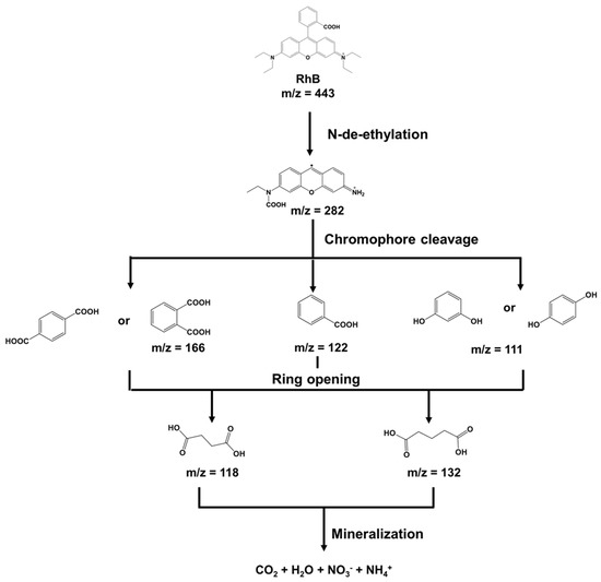 In addition, after being exposed to light from the FeOX-Slag, the RhB concentration in the solution dropped dramatically, and some degraded product might be generated. Based on the results of gas chromatography–mass spectrometry (GC–MS) tests on RhB residues, Figure 9 shows a possible process for RhB oxidation. When the degraded solution was analyzed at 90 min after the photocatalytic process, it was found to have a lot of small pieces of RhB molecules (peaks with m/z values of 111, 118, 122, 132, 166, and 282). RhB molecules can be broken down into smaller, less dangerous molecules by using processes like N-demethylation, chromophore cleavage, and ring-opening to change their structure.