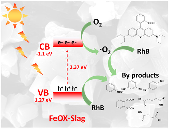 Figure 10 depicts a proposed photocatalytic RhB mineralization process using FeOX-Slag, which is based on the results of this investigation. VB and CB of the FeOX-Slag were 1.27 and −1.1 eV. Thus, FeOX-Slag produced electron–hole pair when exposed to light. Hole production in the VB occurred synchronously with the transportation of the excited electrons to the CB of the FeOX-Slag. The presence of Mn and Mg impurities within the FeOX-Slag has the potential to create a novel electronic state that can effectively capture and confine photogenerated electrons. The extended lifespan of charge carriers in the reaction was achieved by FeOX-Slag through the transfer of electrons to the newly formed electronic state induced by the presence of impurities. This process effectively prevented the recombination of photogenerated charge carriers. Consequently, the engagement between the electrons generated by light and the dissolved oxygen molecules in water led to the formation of superoxide radicals (•O2−) as a byproduct in the process of photocatalysis. Simultaneously, the presence of h+ in the valence band of the FeOX-Slag has the potential to directly oxidize and decompose RhB molecules into water (H2O). The two active radicals effectively facilitated the mineralization of RhB molecules, resulting in the formation of negligible quantities of non-toxic byproducts. Hence, the employment of converter slag for the synthesis of iron oxalate presents a promising approach in developing a highly effective photocatalyst for the mineralization of RhB. This is achieved through the enhancement of optical characteristics and the promotion of separation of charge carriers.