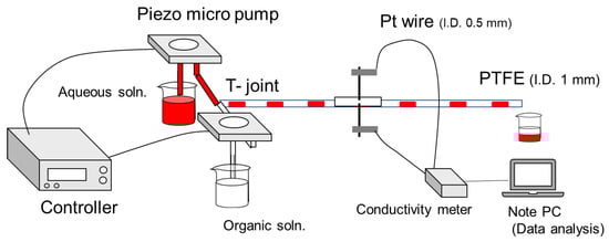 Figure 1 illustrates a schematic of the experimental apparatus used in this study. The aqueous and oil phases were fed into the system using a piezo micropump (PMP, APP-20 KG, Takasago Electric Industry Co., Ltd., Nagoya, Aichi, Japan), which offered minimal pulsation, and these phases were combined in a T-tube. Post-merging within the T-tube, a pair of platinum wires, each 0.5 mm in diameter, were inserted perpendicularly to the axial direction of the PTFE tube. The PTFE tube has an inner diameter of 0.5 mm. The platinum wire was affixed to the outside of the tube using a small amount of adhesive after creating a small hole through which the platinum wire passed, slightly protruding through the inner wall from the outside. This ensured that the platinum wire was in contact with the liquid. Only 0.1 mm of the wires came into contact with the fluid flowing within the tube. Lead wires were utilized as electrodes, connecting the platinum wires to an electrochemical measuring device (Seyssinet-Pariset, France, Bio-Logic Science Instruments, SP-150). The minimum sampling interval for this device is 2.00 × 103 μs, adequate to capture temporal variations in the slug flow. The electrochemical measurements were conducted under the following conditions: a voltage of 0.5 V, a frequency of 1 kHz, and a maximum current of 10 mA. Although the viscosity of the liquid can be influenced by the magnitude of the electric field, the experiment was designed such that the electrolysis’s magnitude was not expected to impact the current value, given that measurements were made at a constant voltage, ensuring appropriate current flow in each solution. The experiment measured conductivity in a constant voltage mode. The impedance of the electrochemical apparatus is 1 TΩ, and the impedance between electrodes is sufficiently small (below 30 GHz) to not interfere with the measurements. Temporal shifts in conductivity were continuously monitored, and data were analyzed using a personal computer. The lengths of the aqueous and oil phases of the slug flow were gauged by photographing the fluid as it coursed through the PTFE tube and determining the slug length from the captured image. Thirty images were analyzed, and the arithmetic means and standard deviations were computed. Fluid ejected from the tube was collected in a graduated cylinder for a fixed period, allowing the calculation of the volumetric flow rate from the fluid’s volume. The extraction rate was determined by analyzing the concentration of each ion in the aqueous phase, which was ascertained through atomic absorption spectrophotometry (AA6200, Kyoto, Japan, SHIMADZU CORPORATION).