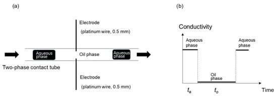 As depicted in Figure 2a, a thin platinum wire is inserted midway through the PTFE tube, through which the slug flow moves. This wire serves as an electrode for continuous measurement of conductivity. As presented in Figure 2b, a high conductivity is obtained when the water phase passes between the electrodes (ta), and a low conductivity is recorded when the oil phase passes (to). The lengths of the water and oil phases of the slug flow, La and Lo, respectively, can be calculated by multiplying the time, ta, which is determined from the linear velocity, u, as follows: