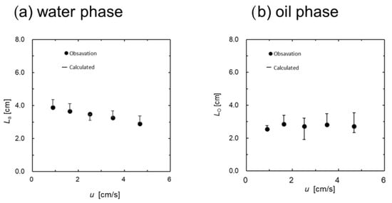 Comparison of slug length calculated from the electrical conductivity and the actual measurement. Flow velocity u [cm/s] (0–6) corresponds to flow volume [cm3/s] (0–2.83). (a) water phase, (b) oil phase.