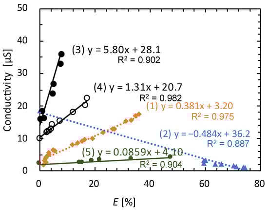 For the extraction systems outlined in Table 1, solutions with various extraction rates were prepared by conducting batch experiments. The aqueous phase was then introduced into an extraction tube, and the conductivity was measured and found to be unaffected by the flow rate. The relationship between the extraction rate and conductivity for each extraction system is presented in Figure 4.