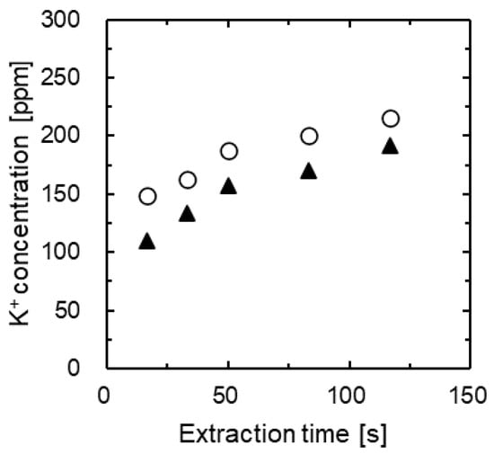 Figure 5 shows the results of conductivity measurements for the solution in System 1, operating at a flow velocity of u = 0.003 m/s. The electrodes were positioned at various points within the PTFE tube, leading to different extraction times. The ▲ symbol denotes the measurements taken using the apparatus displayed in Figure 2. Zero signifies the quantity of liquid discharged from the outlets of PTFE tubes of varying lengths. The concentration of potassium ions in the collected liquid was gauged by flame spectrometry, and the extraction rate was calculated accordingly. The quantity of potassium ions in the aqueous phase decreased as the extraction time increased, indicating ongoing extraction as the oil phase flowed through the PTFE tubes. The zero measurement was invariably larger than ▲, which can be attributed to ongoing extraction even during the brief period when the liquid discharged from the tube is in storage.