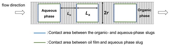 The methodology for calculating the specific interfacial area of the oil–water interface in slug flow is illustrated in Figure 7. When slug flow transits through a hydrophobic tube-like PTFE, the oil phase (cyclohexane) forms a continuous phase, and the aqueous phase transforms into a dispersed phase. Although the oil–water interface exhibits curvature, it is presumed flat, as depicted in Figure 7. The error arising from this presumption is considered to be minimal and insignificant in comparison with the overall specific interfacial area. The tube’s radius is symbolized by r, while the lengths of the slugs in the oil and water phases are represented by Lo and La, respectively. The distance between the dispersed phase and the tube wall is considerably smaller than the tube diameter, and it is considered negligible in terms of volume. Consequently, we determined the specific surface area per unit volume of the oil phase utilizing Equation (7).
