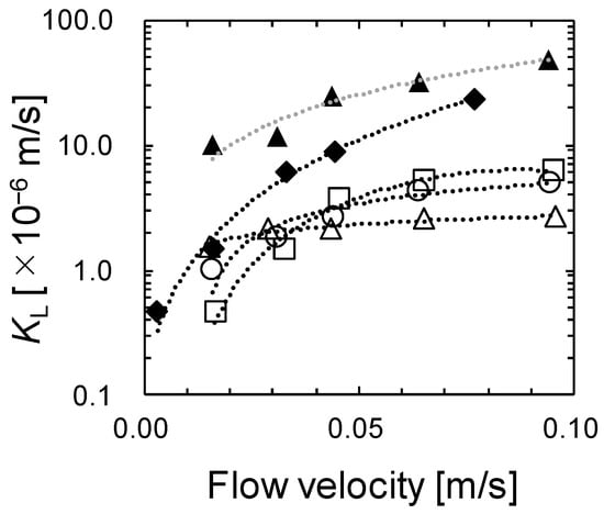 Effect of linear slug velocity on KL. ▲: 1, ■: 2, □: 3, ○: 4, △: 5 The numbers are shown in Table 1. Flow velocity [cm/s] (0–0.10) corresponds to flow volume [cm3/s] (0–0.04).