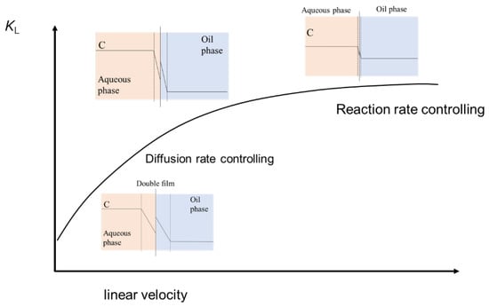 At lower liquid speeds, KL is significantly influenced by the linear velocity. However, as the linear velocity increases, the rate of KL’s increase diminishes. In Systems 3–5, which exhibit a relatively low extraction rate absent any neutralization reaction, KL remains nearly constant even when the linear velocity surges. This phenomenon occurs as the rise in linear velocity thins the boundary film of mass transfer at the oil–water interface, thereby promoting mass transfer in the vicinity of the interface. Nonetheless, the reaction at the interface is rate limiting.