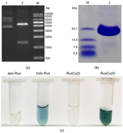 The type-C rusticyanin gene was successfully amplified using PCR in two steps from the genomic DNA of A. ferrivorans SS3, and finally ligated into the expression vector, as confirmed with enzyme-digested agarose gel electrophoresis analysis (Figure 1a). The constructed pET-30a::RusC plasmid was further verified usiing DNA sequencing and shown to be completely correct. PCR techniques were used to successfully add a six-His-tag to the N-terminal of the protein, which enabled to adopt the one-step affinity chromatography and greatly accelerated the protein purification process.