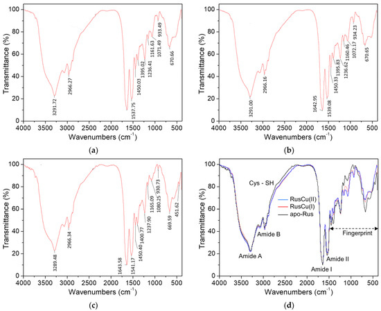 The FTIR spectra of the type-C rusticyanin have a series of typical vibrational absorbance bands, as described in the review of vibrational spectroscopy for proteins [22] (Figure 4). The regions around the peaks at 3289 and 3070 cm−1 correspond to the amide A and B bands, respectively, which are responsible for the NH stretching vibrations of peptides. The region around the peak at 1643 cm−1 is the amide I band, which is mainly from the C=O stretching vibration of peptides and can be used for protein secondary-structure analysis. The peaks at 1541 cm−1 correspond to the amide II band, mainly from the out-of-phase combination of the NH inplane bend and the CN stretching vibration. The FTIR spectra of the type-C in apo-, oxidized, and reduced forms are highly identical in the amide I and II bands, indicating that neither the copper cofactor bound or unbound nor the switch between the oxidized and reduced states hardly alter the secondary-structure conformation of the protein, which is well in line with previous reports [1,9]. Although the spectra of the protein in all forms are broadly identical, they differ in detail, showing changes in the relative intensities, especially for the apoprotein (Figure 4d). Firstly, a weak difference is present in the range from 2750 to 2150 cm−1 for the apoprotein, where a turn is present around the site at 2600 cm−1 corresponding to the sulfhydryl group of the only cysteine in the protein. Secondly, the most obvious difference is the range from 1450 to 400 cm−1 for all the forms, but it is difficult to straightforwardly assign these different bands to individual molecular groups; alternatively, they can be seen as a characteristic fingerprint of conformational change to define or detect the transient conformational states of the protein. Similar approaches have a long history in fluorescence and absorption spectroscopy [30]. However, this is the first report on FTIR characterization of rusticyanin, so comparable information is not available at present.