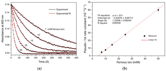 Figure 5a shows the time course of absorbance at 600 nm in the presence of various concentrations of ferrous ions and the oxidized form of rusticyanin. Each of these traces provides a representative pseudo-first-order behavior of exponential decay in visual observation. When Equation (4) was fitted to each trace independently, all the theoretical lines fit the data closely, and then the pseudo-first-order rate constants for different concentrations of ferrous ion were obtained. Figure 5b shows the dependence of the pseudo-first-order rate constant for the reduction in rusticyanin by ferrous ions. The pseudo-first-order rate constants determined via linear fitting above are plotted vs. the concentrations of iron ions, where a good linear relationship between them is exhibited.