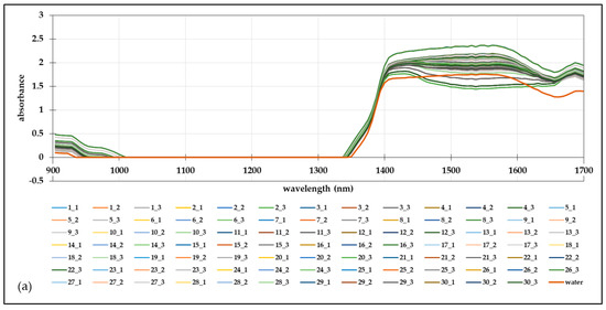 In this work, an analysis of the NIR spectra of the grape skin extracts prepared according to the experimental design in 30 independent experiments was performed. The continuous NIR spectra were recorded in the wavelength range of 904–1699 nm. Figure 1a shows the raw spectra for all the prepared extracts and for pure water, thus providing valuable insights into the extracted components and their intensity. The accurate analysis of the NIR spectra of samples with potential antioxidant activity is very important for predicting the spectra of new components, understanding changes in the color of plant species, and understanding the ability of molecules to undergo chemical changes in the NIR range [55]. It was observed that in the NIR region there was a significant jump in absorption in the wavelength ranges of 900–950 nm and 1400–1600 nm. The reported wavelength ranges indicate that C-H and O-H bonds were detected in the samples, which, given the nature of their preparation, suggests that the samples contained water. The wavelength range of 1410–1600 nm indicates that C-H bonds were present in the sample, suggesting that the samples contained phenols and antioxidants [56]. It is also worth highlighting that a straight spectral line was observed in all 30 prepared extracts, extending in the wavelength range of 930–1350 nm and indicating the absence of N-H bonds, i.e., proteins [57]. It should also be noted that the spectra of the prepared extracts followed the trend of the spectrum of pure water, but the absorption maxima differed in the wavelength range of 1410–1700 nm. The grape skin extracts show a higher absorption maximum than pure water, as expected.