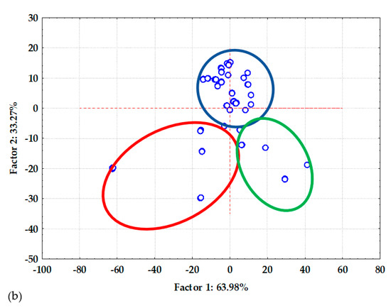 (a) NIR spectra of all prepared aqueous grape skin extracts and pure water; (b) PCA analysis of raw NIR spectra of all prepared aqueous grape skin extracts. The extracts in the green oval were prepared at T = 40 °C; those in the blue oval were prepared at T = 60 °C; and those in the red oval were prepared at T = 80 °C.