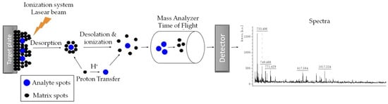 Over the last decades, matrix-assisted laser desorption/ionization time-of-flight mass spectrometry (MALDI-TOF MS) has become a popular and versatile analytical approach to establish potential cancer biomarkers, even at low concentration levels. This analytical approach has an interesting potential as a clinical tool since it is easy to use, cost-effective, and fast in terms of analysis time []. This analytical approach consists of a soft ionization process by means of a laser that reaches the analyte mixed with a solution of a matrix in an organic solvent [e.g., α-cyano-4-hydroxycinnamic acid (HCCA), 2,5-dihydroxybenzoic acid (DHB), 3,5-dimethoxy-4-hydroxycinnamic acid (SA)] able to absorb energy in the form of UV light. The mixture is first deposited onto a sample plate known as a target, in which the solvent then evaporates, and the sample is co-crystallized. After a bombardment by a pulsed laser beam (UV or infrared radiation), the matrix molecules that are energetically ablated from the surface of the sample transfer protons to the analyte, resulting in the formation of intact gas-phase molecular ions (which usually carry a single positive charge), Figure 2. After the ionization process, the masses can be analyzed by TOF MS, which accelerates the gas-phase ions in a high-voltage electric field, which transmits a constant amount of kinetic energy that will cause the smallest of the ions to travel the fastest and, consequently, become separated by mass (the heavier the ions, the longer the time of detection). The TOF reflector mode analyzer reflection mode provides a greater resolution because it is equipped with a longer flight path, ion mirrors, and electric fields that refocus ions by their masses [].