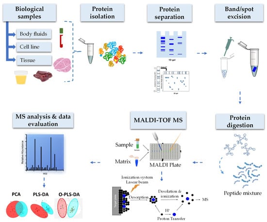 MALDI-TOF MS is an unconventional technology for investigating protein profiles in clinical samples. Numerous studies have reported that protein profiling is of impressive significance in the diagnosis of distinct types of cancer [,,,,,,,,,]. An overall workflow involves a sample preparation followed by MALDI-TOF MS acquisition, preprocessing, and statistical analysis of the data, Figure 3. The critical steps in the establishment of potential cancer biomarkers mentioned previously will be discussed in the following subsection.