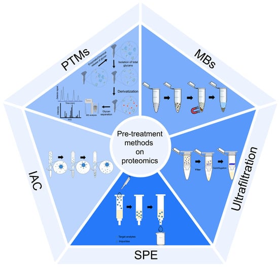 The biological fluids (e.g., blood, urine, tissues) are complex samples in terms of proteome/peptidome profile, and it is necessary that the applied simple, fast, and cost-effective sample preparation procedures reduce the samples’ complexity, consequently increasing the detection of low-abundant proteins []. Regarding Table 1, some studies performed in the proteomic field include ultrafiltration, dialysis with subsequent lyophilization, and precipitation by organic solvents [,,,].
