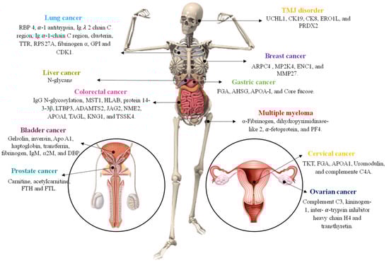 Bladder cancer has a high rate of morbidity and mortality and is the tenth most prevalent cancer in the world []. Reappearance and disease progression to the muscle-invasive phenotype are the primary problems encountered throughout the clinical therapy of bladder cancer. Because of this, a successful outcome depends greatly on early diagnosis and efficient, individualized treatment. Currently, the recommended methods for diagnosing BC are cystoscopy and urine cytology []. Nedjadi et al. [] used two-dimensional difference gel electrophoresis (2D-DIGE) coupled with MALDI-TOF MS as a powerful approach for the discovery of biomarker proteins connected to insistent forms of urothelial bladder cancer. Nine plasma proteins are suggested as possible biomarkers by the findings, including the serum amyloid P component, mesoderm development candidate-1, plasma membrane calcium-transporting ATPase-1, plasminogen, gelsolin, inversin, and apolipoprotein A1. Among them, apolipoprotein A1 (Apo A1) displayed elevated specificity and sensitivity (AUC = 0.906), and for this fact, could act as a possible biomarker for bladder cancer progression, delivering a new perspective on this disease’s diagnosis. In addition, Lemańska-Perek and collaborators [] established the plasma proteome maps from patients with urothelial bladder cancer using two-dimensional sodium dodecyl sulfate polyacrylamide gel electrophoresis (2D SDS-PAGE) combined with MALDI-TOF MS. The preliminary results suggest vitamin D-binding protein, haptoglobin, transferrin, fibrinogen, IgM, complement C3b, alpha-2-macroglobulin, and pigment epithelium-derived as potential biomarkers associated with bladder cancer, Figure 5.