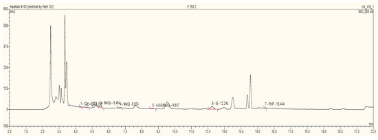 After combining the meatball sample (1 g) with 12 mL of NaOH (1 M) and stirring for 1 h, the Extrelut NT packaging material (10 g) was placed on it and mixed thoroughly and packaging was done with an Oasis MCX cartridge. Afterwards, the extraction was done out with ethyl acetate (75 mL), methanol (2 mL), and HCl (0.1 N, 2 mL), and in the last step, the extract was eluted with 2 mL of methanol:ammonia (NH3, 32%) (19:1). The obtained extract was stored at −18 °C until High Performance Liquid Chromatography (HPLC) analysis. Prior to the analysis, the extract was placed in an oven at 45 °C overnight to eliminate methanol:NH3, and subsequently, methanol (100 µL) containing the internal standard (4,7,8-TriMeIQx) was added for analysis using the HPLC-Diode Array Detector system [39]. The incorporation of an internal standard (4,7,8-TriMeIQx, 1 ng/mL) was intended to increase the precision and accuracy of the obtained results and to understand whether there was a shift in the other HAAs’ peaks or not. In HPLC analysis, the injection volume was determined as 10 μL. In this study, the levels of HAAs present in the samples were measured by conducting standards at different concentrations. The identification of HAAs involved a comparison of their retention times in the samples and the retention times of HAAs whose UV spectra are known as standard. For the quantitative determination of HAAs, the external calibration curve method was employed. The basis for determining the recovery was the standard addition method. For this purpose, a mix stock solution at concentrations of 1, 2.5, 5 and 7.5 ng/g was added to the raw sample before extraction. The peak area against the amount of analyte added was drawn as curve. The recoveries were calculated based on the ratio between the slopes of the linear regression lines for the standard addition and the HAA standard solutions. HPLC conditions (Table 1) for the HAA analysis were referenced by Oz et al. [40].