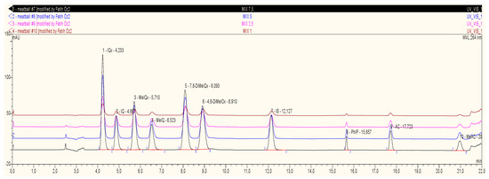 The standard addition method was preferred to calculate the recoveries of the HAAs examined in the study, and HAA mixture stock solutions at concentrations of 7.5, 5, 2.5 and 1 ng/g were added to the raw meatball samples before extraction. After the extraction and analysis performed for this purpose, the recoveries were determined. The LOD and LOQ values calculated according to the Signal/Noise (S/N) ratios from the HAA concentrations at certain concentrations are given in Table 4. The detected recoveries (81.52–95.64%) of the HAA compounds examined in this study are in agreement with the literature [39]. In addition, the chromatograms of the meatballs with the highest total HAA content and HAA mix stock solution are given in Figure 1.