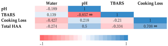 The correlation analysis of all parameters examined in meatball samples is given in Figure 2. A strong and very significant positive correlation (r = 0.708; p < 0.01) was determined between total HAA content and cooking loss, while a strong and very significant negative correlation (r = −0.857; p < 0.01) was found between pH and TBARS values. The water percentage of the meat is important in transporting the precursors of the HAAs to the meat surface. During cooking, the substances that are removed with the water come to the outer surface of the meat and contribute to the formation of HAA [24]. Indeed, the negative correlation between water content and cooking loss confirms this situation. Therefore, increased cooking loss results in higher HAA content. In this study, the use of cumin in meatball samples increased the pH value. On the other hand, the use of cumin in meatballs decreased the TBARS value with its antioxidant effect. In this context, the negative correlation between TBARS and pH value is explained by the use of cumin.