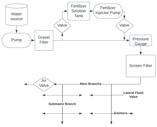 From the relevant reservoir, a pump delivers the water through filters (mostly gravel) to the pressure regulator and then to the screen filter [55]. The water is then fed to the main branch, from where it is sent to several sub-branches (Figure 1). Fertilizers can be applied through this type of system. This can result in a reduction in the fertilizer amount and costs [56].