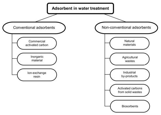 In water treatment, adsorption is an effective process for the removal of contaminants, in which ions and molecules are removed from the liquid phase via adsorption to the solid phase [84,85]. The adsorbent material can be a mineral, organic or biological material [86]. The selection of a suitable adsorbent for the removal of pollutants in water depends on the concentration and type of the pollutant, the adsorbent’s adsorbing capacity, and its efficiency [85]. The adsorption capacity of adsorbents is influenced by temperature, pH, the adsorbent dose, adsorbent particle size, agitation speed, and contact time [87]. A direct comparison of the results obtained using different adsorbents is therefore not possible since the experimental conditions are not the same during the different tests. Adsorbents can be divided into two major categories: conventional adsorbents and non-conventional adsorbents (Figure 2, Table 2) [86].