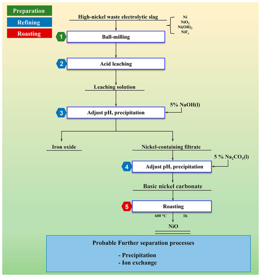 In order to recover valuable metals from high-nickel waste electrolytic slag, a number of industrial methods based on pyrometallurgy, hydrometallurgy, or a combination of both methods have been developed [10]. In pyrometallurgy, the harmful gases released during smelting and the extremely high temperatures required are not economically compensated in the recovery process [11]. In contrast, the hydrometallurgical process allows for better control of nickel recovery, using lower temperatures. And it is theoretically more environmentally friendly due to low energy demand, low gas emissions, and low waste generation. At present, there are various methods for wet treatment of nickel-containing resources, such as chemical precipitation, solvent extraction, ion exchange, electrolysis, etc. Each has its own advantages in practical application [12].
