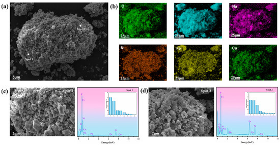 The microstructure of high-nickel electrolytic slag was observed by SEM, and the distribution of elements on its surface was analyzed by EDS. The results are shown in Figure 2. The results show that the surface of the high-nickel waste electrolytic slag presents an unsmooth and unevenly distributed lump agglomeration structure. In Figure 2b, it can be seen that F, Ni, Fe, Na, and Cu elements are uniformly distributed on its surface, which is consistent with the XRF results (Table 1). Figure 2c shows a large agglomeration structure on the surface of high-nickel waste electrolytic slag. The corresponding EDS results show that the relative contents of main elements distributed on the surface are 39.42% F, 31.57% Ni, 10.03% O, and 9.22% N. Figure 2d shows the dense distribution of agglomeration structures on the surface of high-nickel waste electrolytic slag. The corresponding EDS results show that the relative contents of main elements distributed on the surface are 32.59% Ni, 31.89% Fe, 20.69% F, and 6.52% Na. The results of XRF analysis are consistent with those of high-nickel waste electrolytic slag.