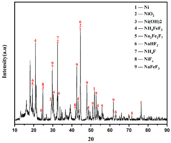 The XRD analysis result of high-nickel waste electrolytic slag is shown in Figure 3. Combined with its main element composition (Table 1), Ni in high-nickel waste electrolytic slag exists in four forms: Ni, NiO2, Ni(OH)2, and NiFx. Iron exists in the form of NH4FeF3. Sodium comes in the form of Na2Fe2F7, NaFeF3, and NaHF2. The presence of iron has an impact on the purity of nickel, so iron removal is required before nickel can be recovered.